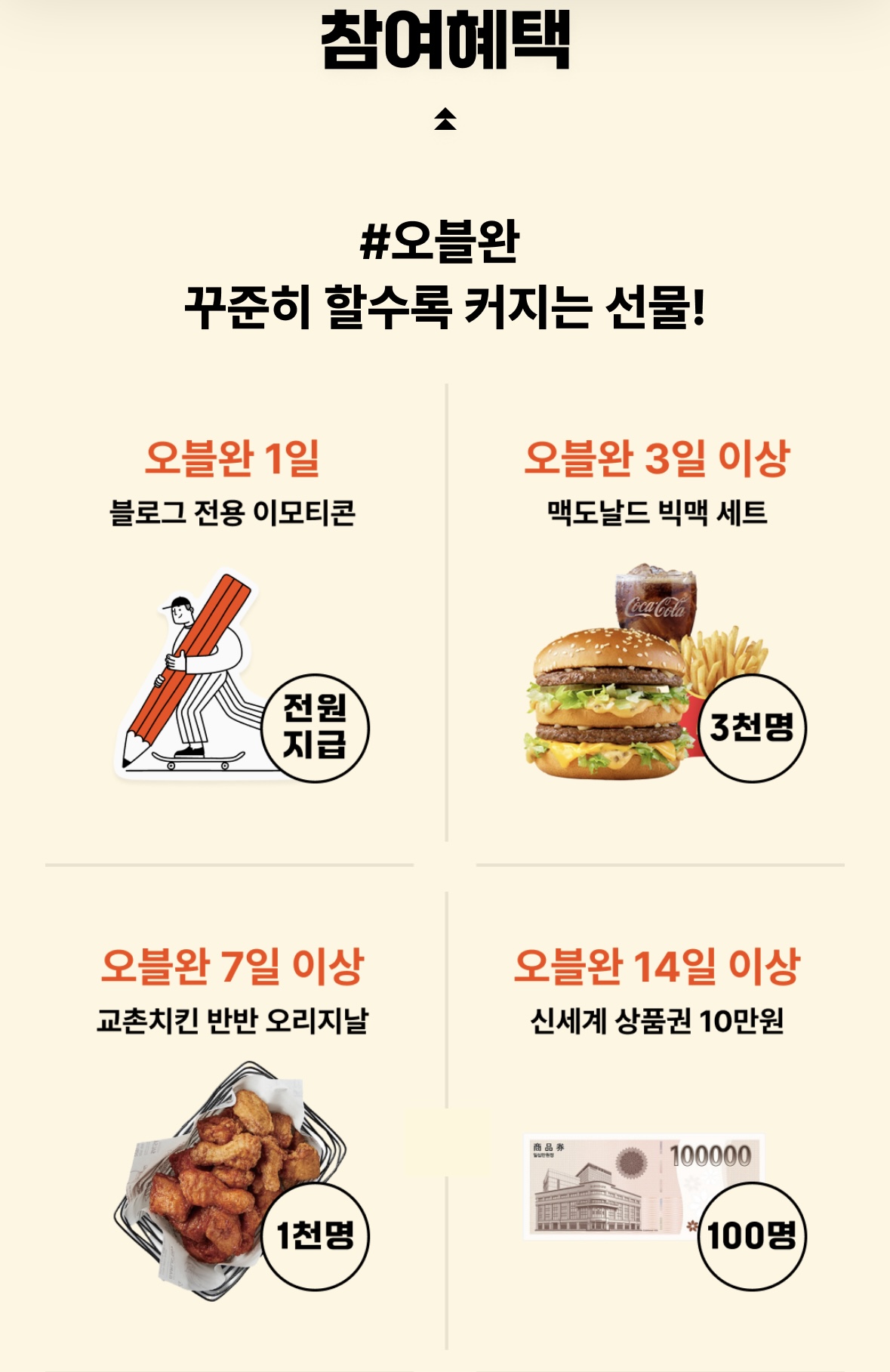 이 기간동안 매일 글을 발행하면 다양한 이벤트에 참여하고 혜택을 받을 수 있다고 하네요!