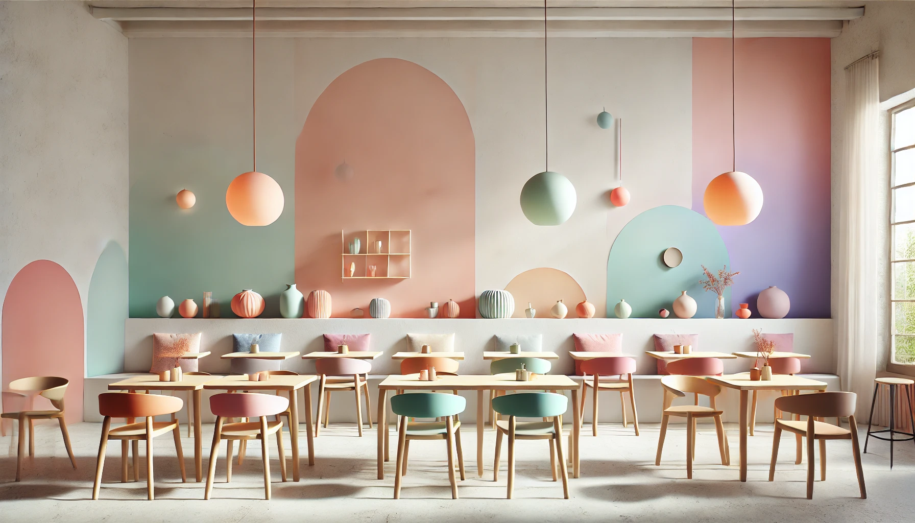 원색이나 파스텔 톤의 벽, 타일, 의자 등을 활용해 밝고 명랑한 분위기를 연출. - 레트로 디자인