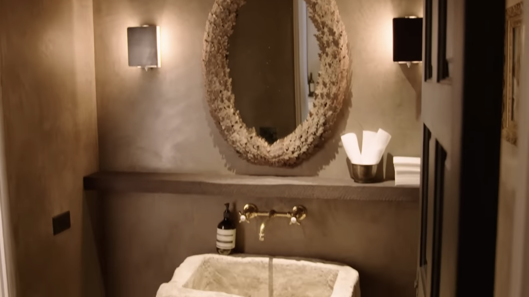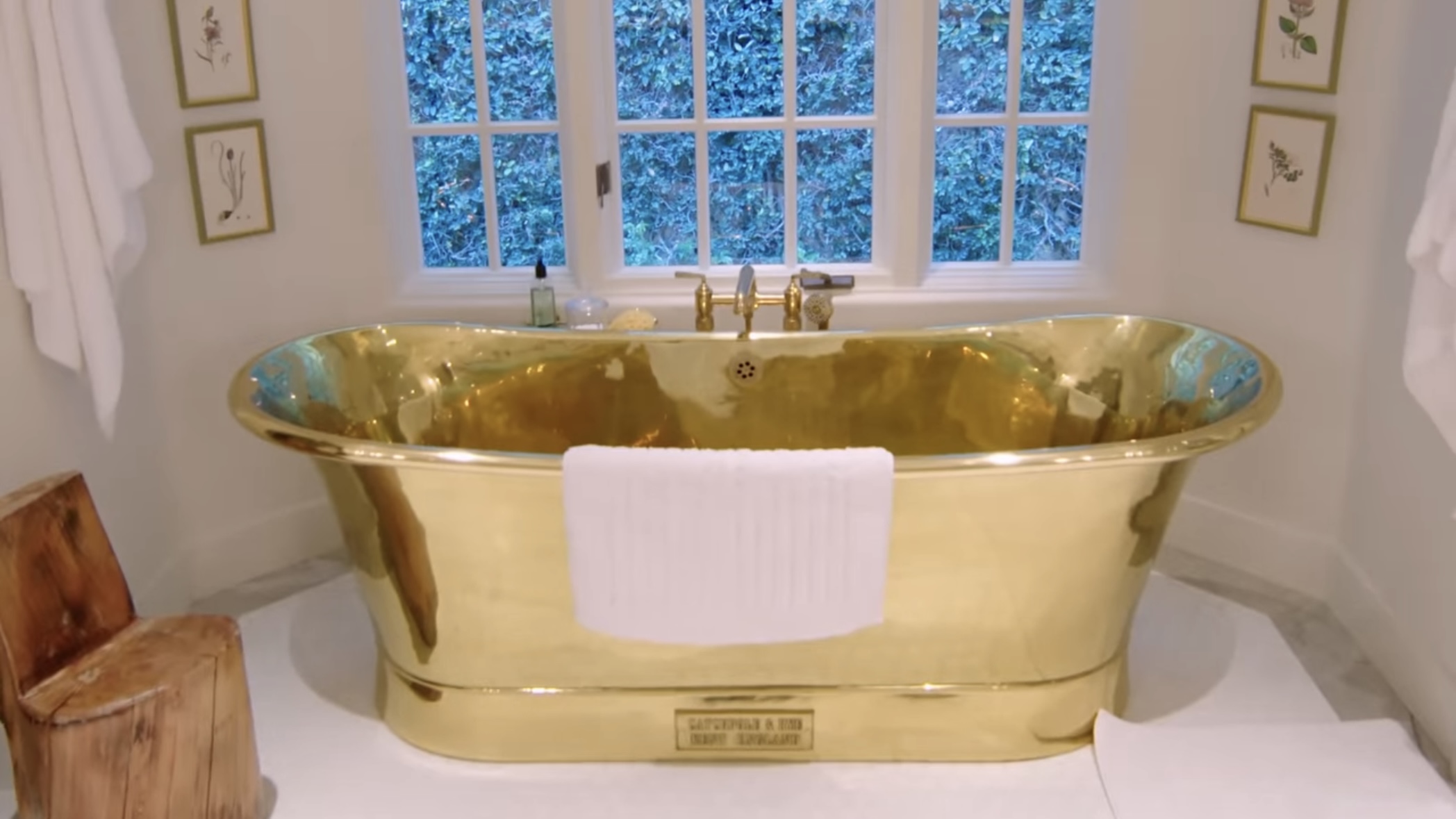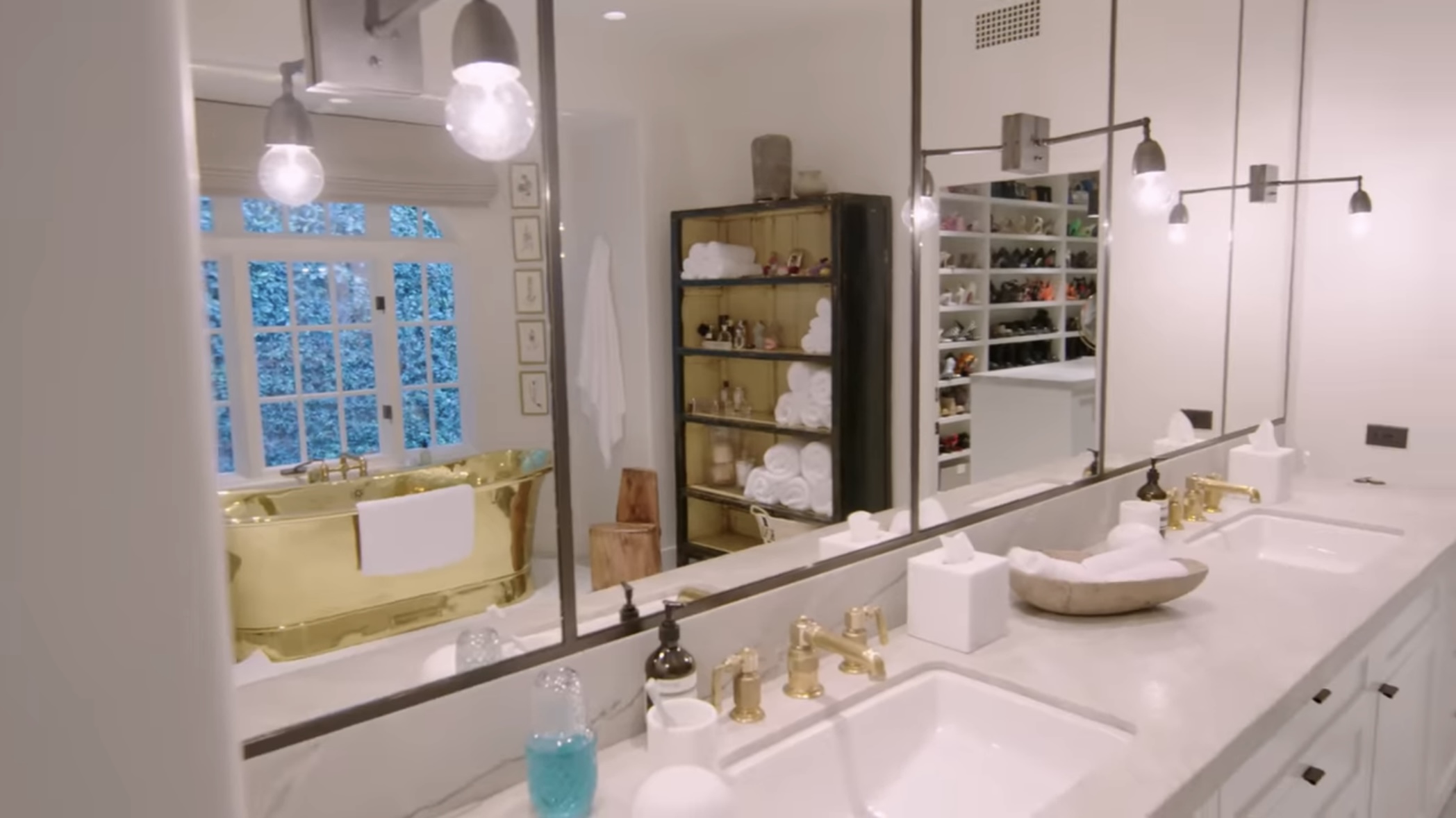 켄달 제너의 욕실은 그녀가 가장 애정을 가지는 공간 중 하나로, 초록빛이 도는 대리석과 골드 욕조가 돋보입니다.