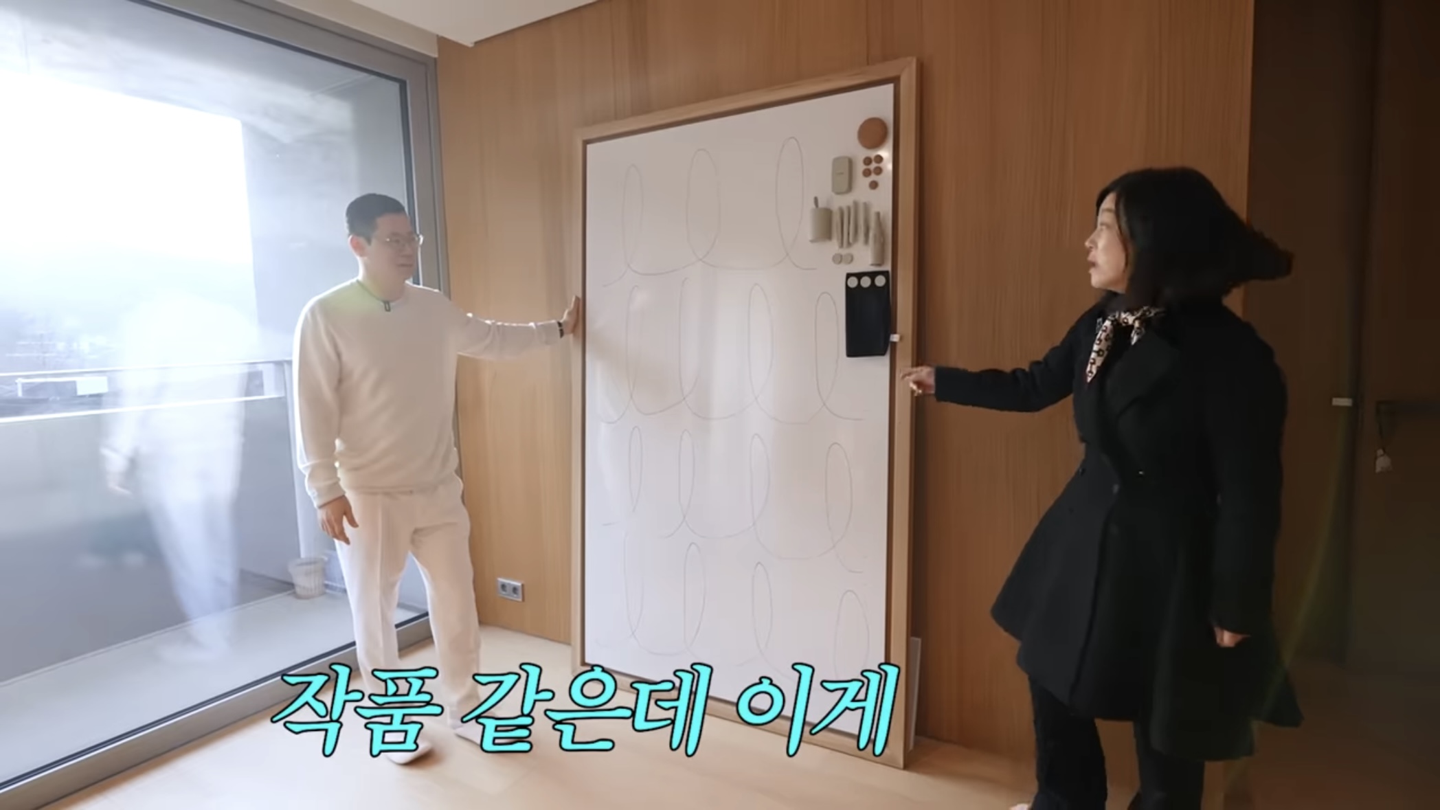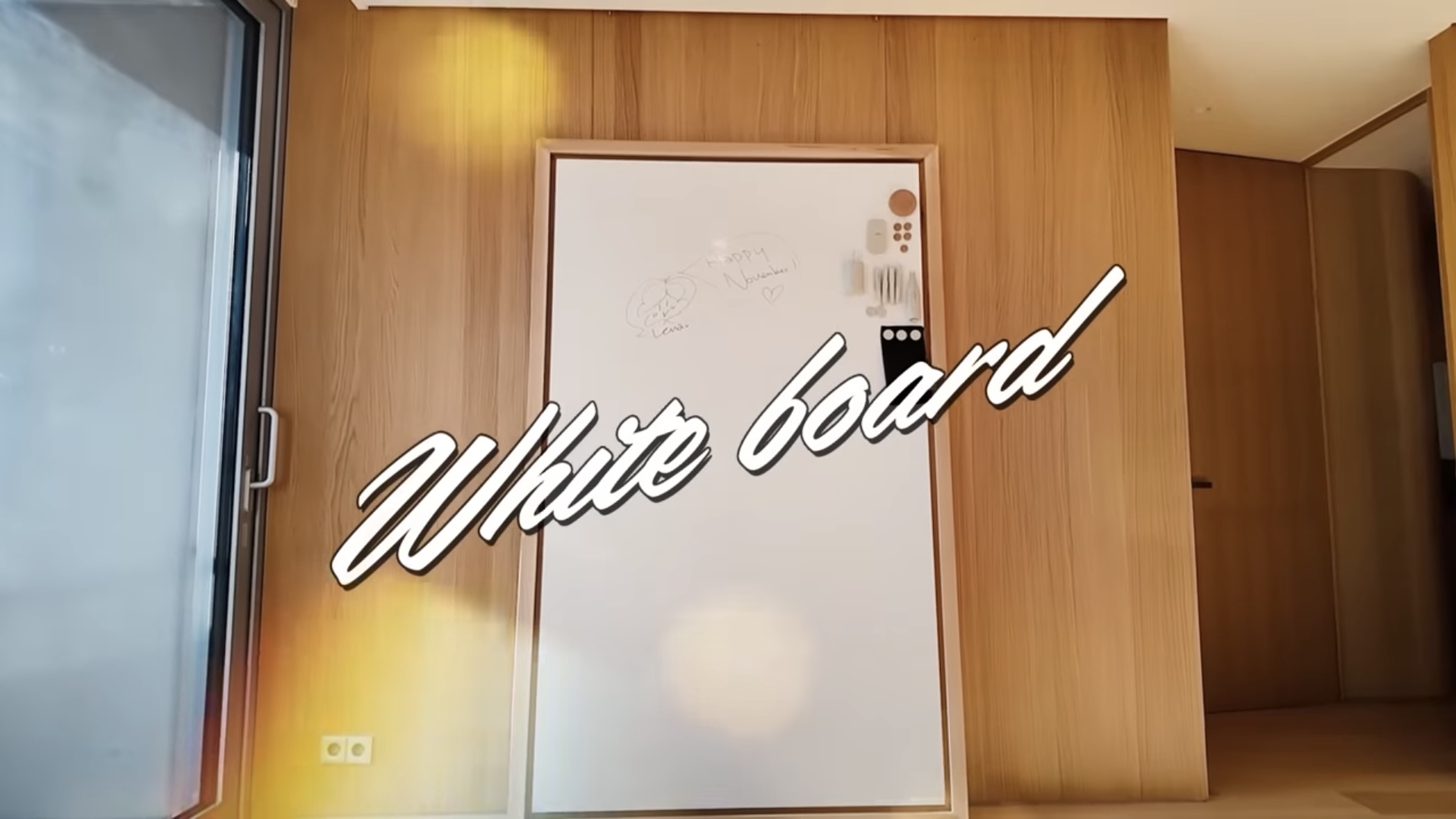 대형 화이트보드는 메모 공간으로도 활용할 수 있지만 이렇게 나무 테두리로 된 큰 화이트보드를 벽에 기대어 놓으니 마치 작품 같은 느낌을 주기도 합니다.