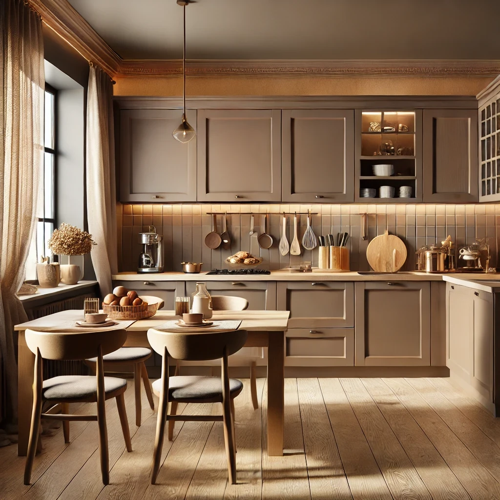 여기에 밝은 우드 톤의 식탁이나 선반을 배치하면 내추럴하면서도 안정감 있는 주방 분위기를 연출할 수 있습니다.